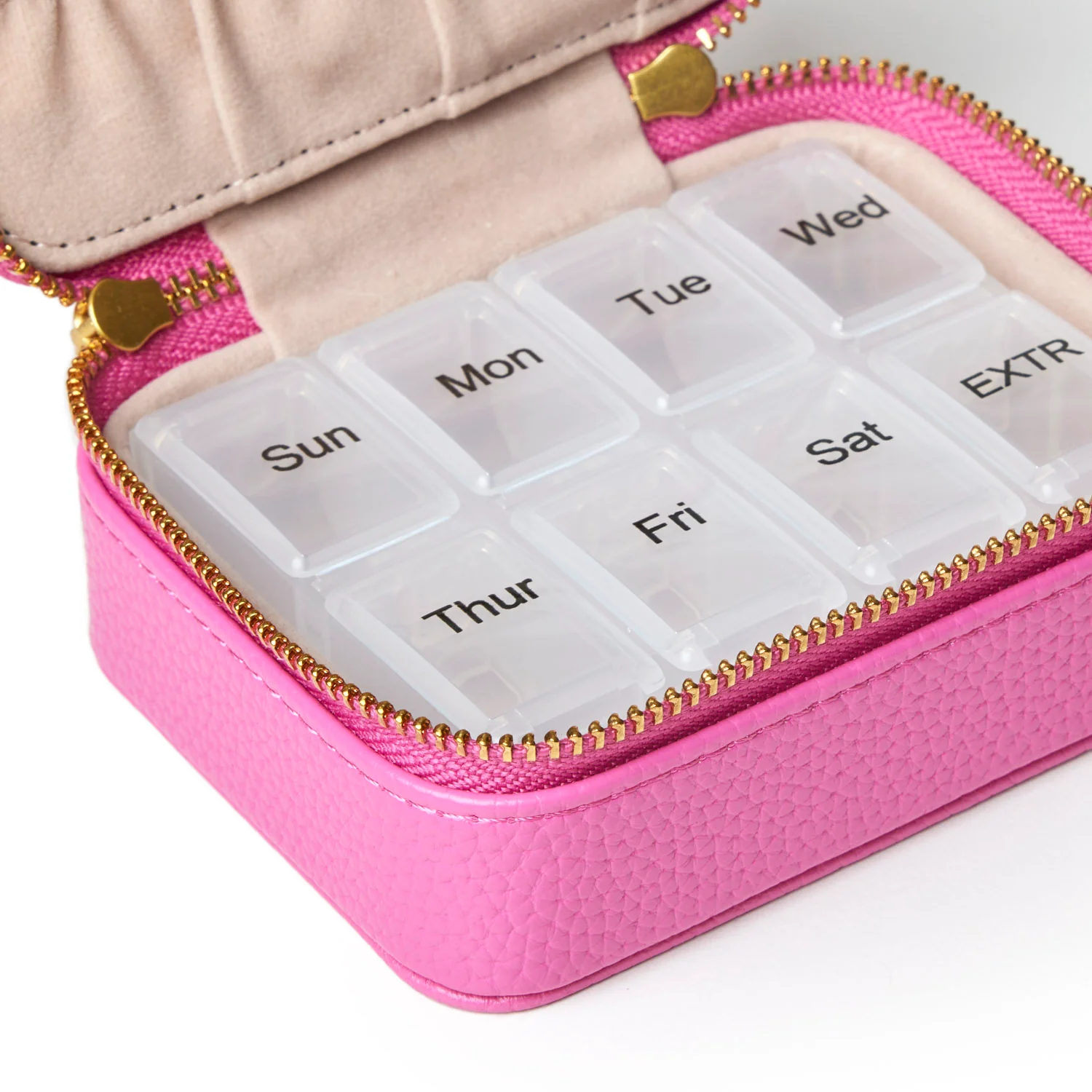 Organized GALs do it better. The Pebble Pill Case is your compact solution for keeping your wellness routine in check wherever the day takes you. Crafted of durable pebble vegan leather, a secure zip reveals an interior slip pocket and removable pill separator that stores vitamins or supplements with ease. Slip it into your tote, carry-on, or gym bag and our signature logo stamp makes it easy to find (and hard to miss).