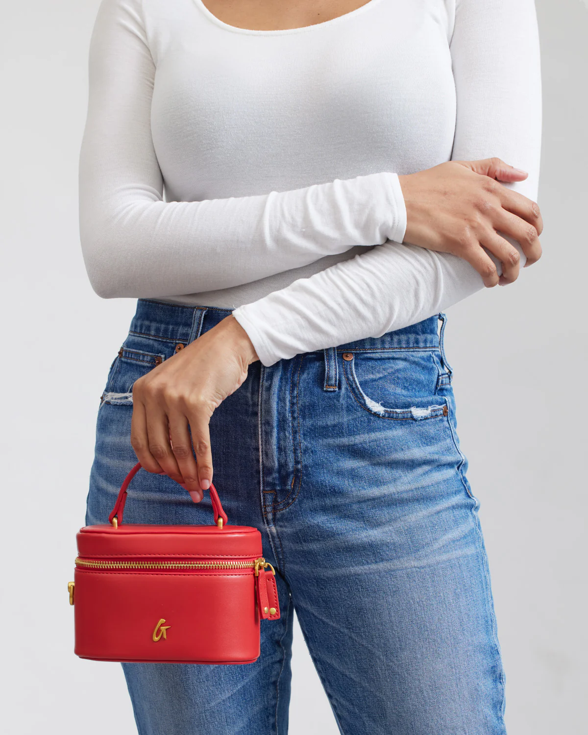 Outfitted in smooth-to-the-touch vegan leather, this Vanity Bag stuns in sleek gold hardware. Worn as a chic purse, its petite compartment holds a Compact Wallet and keys, along with small essentials in a side pocket. The bag touts a removable strap for shoulder or crossbody wear, along with a top handle.