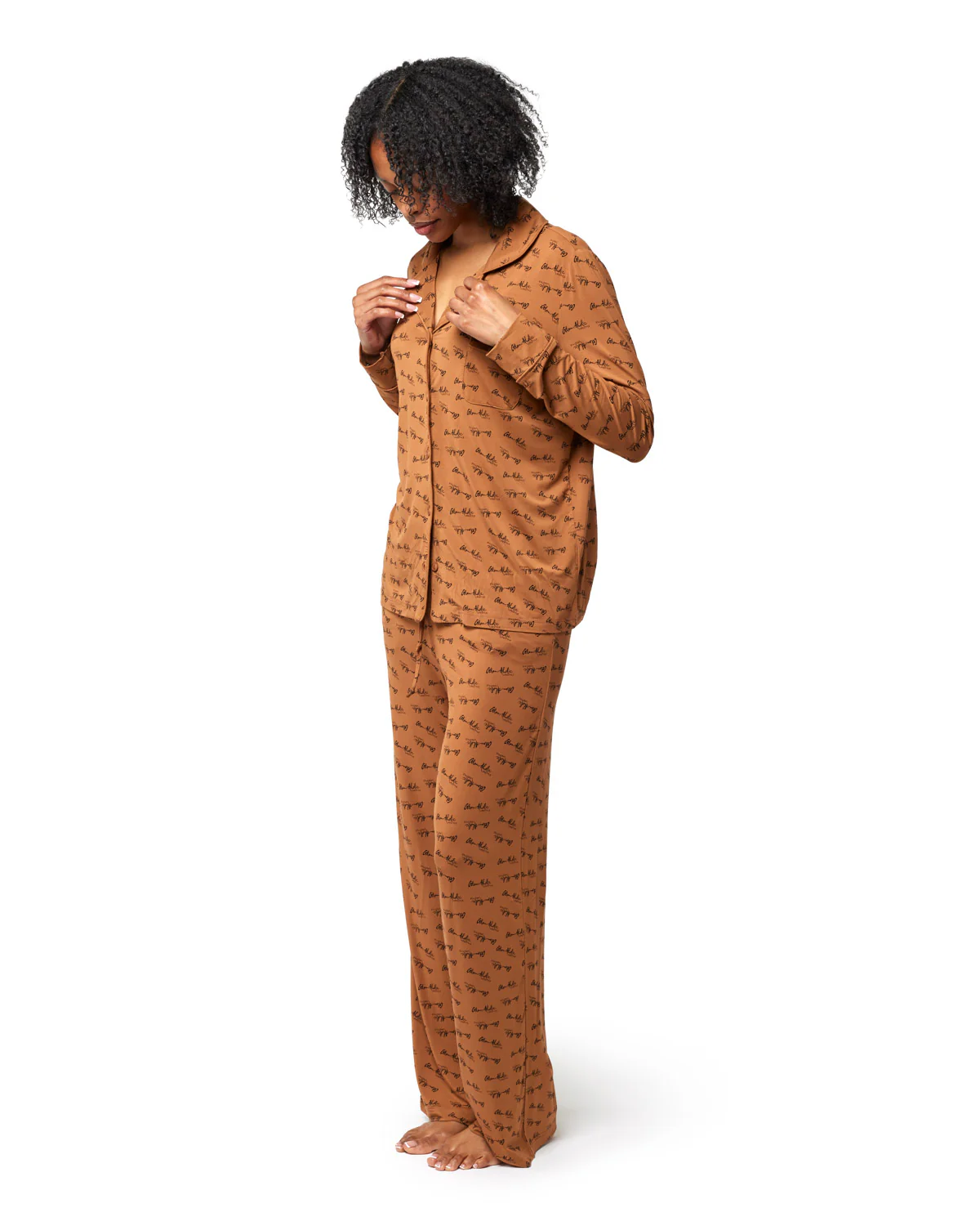 Slip into comfort that still feels put together. The Signature Pajamas are crafted for relaxed days, cozy nights, and everything in between. Designed with a classic button-down top and easy, straight-leg pants, this set features an all-over Glam-Aholic Lifestyle logo print that adds a subtle statement to your off-duty look.